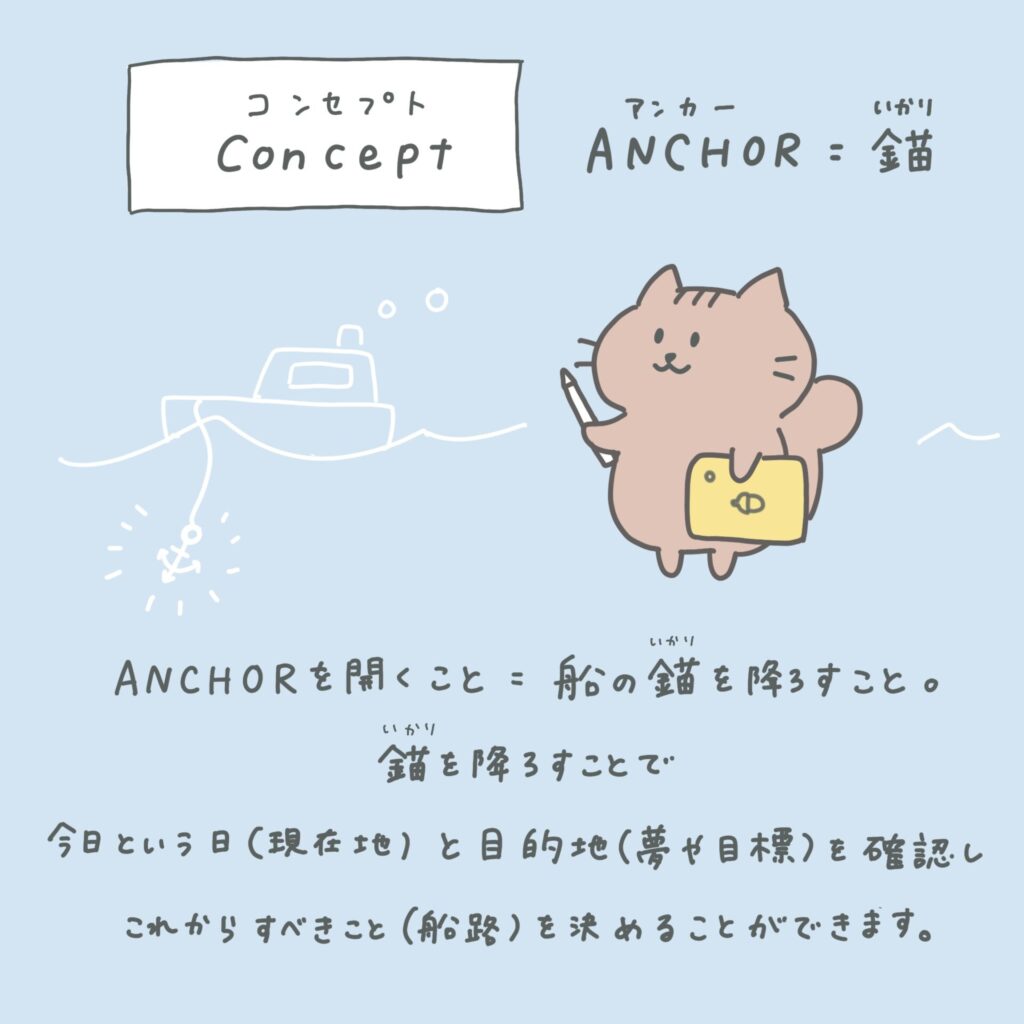 錨を降ろすことで、今日という日(現在地)を確認し、夢や目標を(目的地)を思い出して、これからするべきこと(航路)を決めることができる。