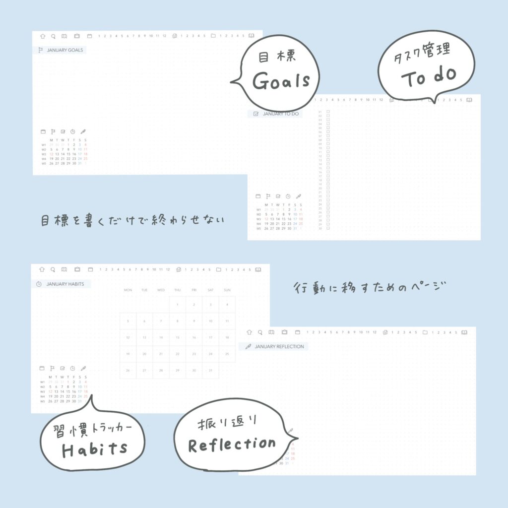 さらに「夢や目標を書いただけで終わらせないでほしい」という思いから、「書くいて行動に移す」をスローガンに、1ヶ月単位で目標をたて、TO DOを管理し、習慣をトラッキングし、振り返りを行うことができるページを加えました。