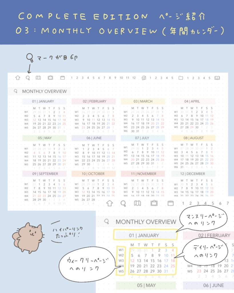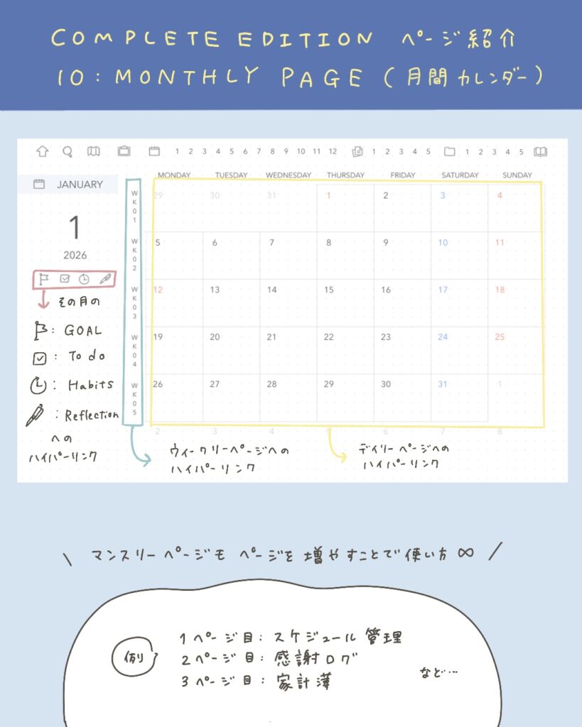 月間カレンダー、週間カレンダー、デイリーページへのハイパーリンクつきです🔗