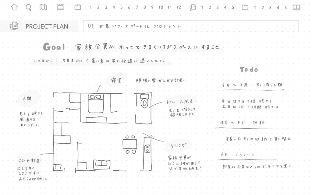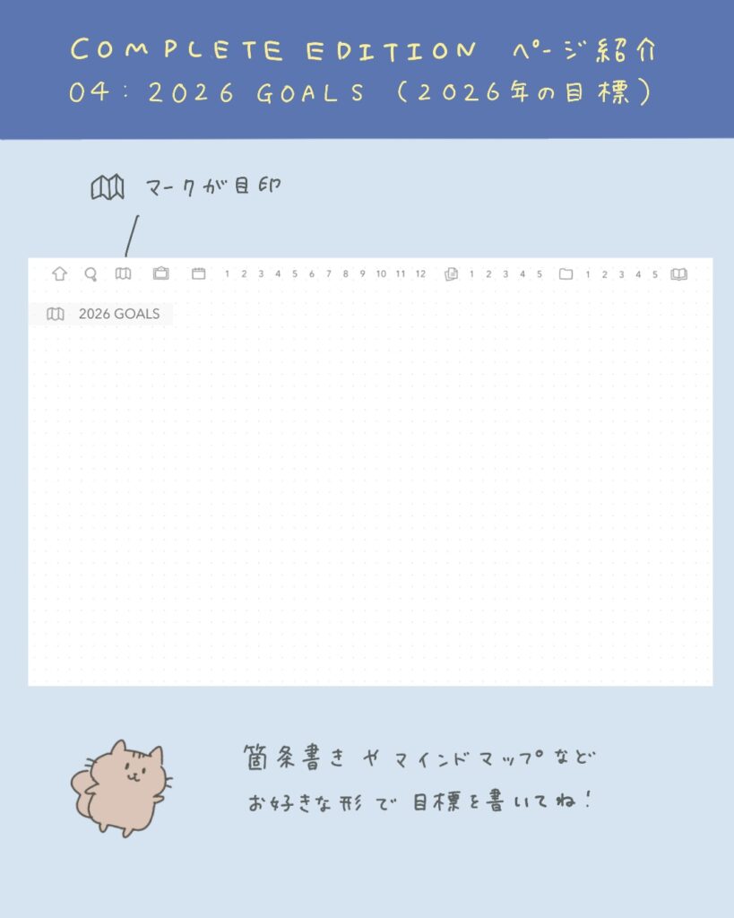 シンプルなドット方眼なので、箇条書きやマインドマップなど、お好きなスタイルで目標を記入してください✍️