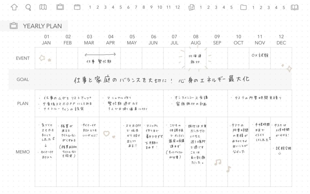 「EVENT」には予定している大きめのイベントを、「GOLS」には年間目標を大きく、「PLAN」には:3ヶ月ごとの具体的なプランを、MEMOにはTo doや1ヶ月ごとのプランを書くのがおすすめです。