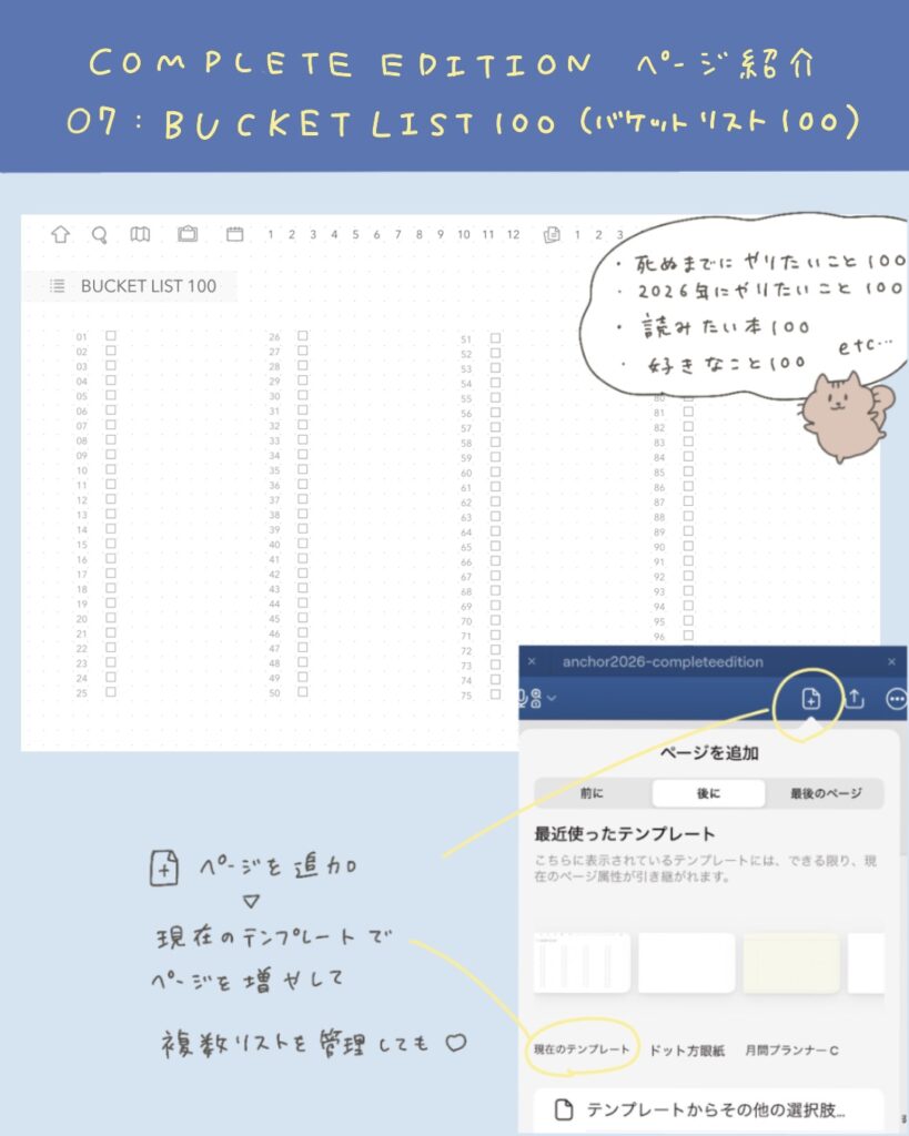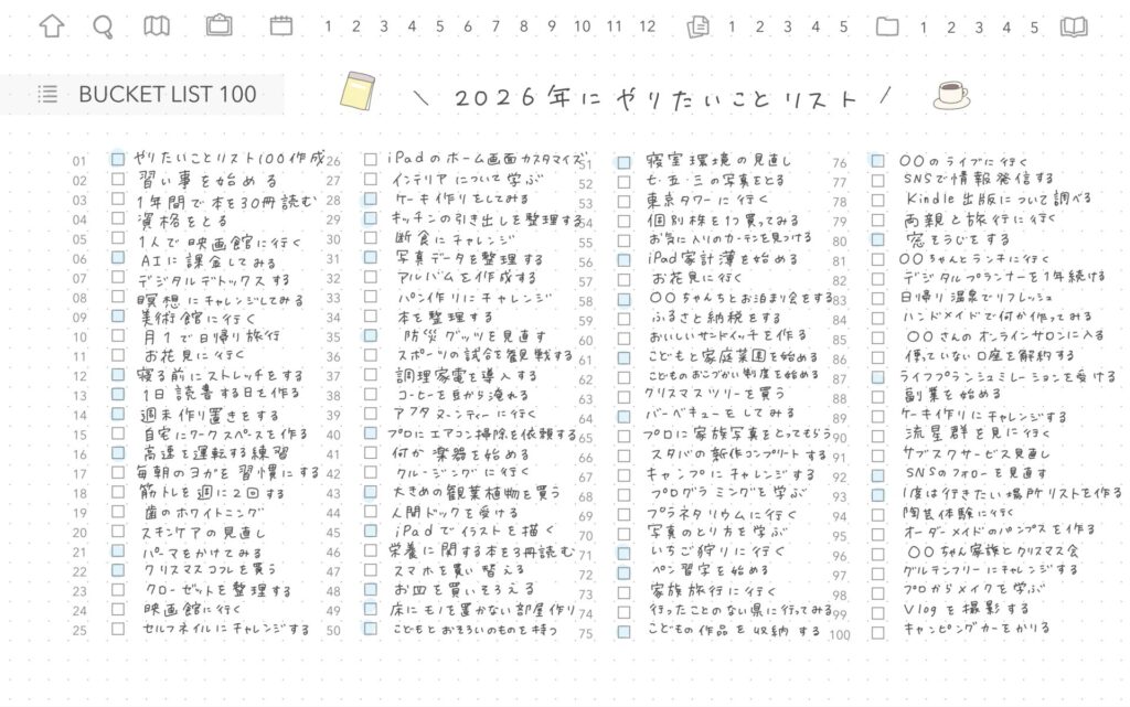 「死ぬまでにやりたいこと100」はもちろん、「2026年にやりたいこと100」、「読みたい本100」など、お好きなテーマで書き出しましょう🫶