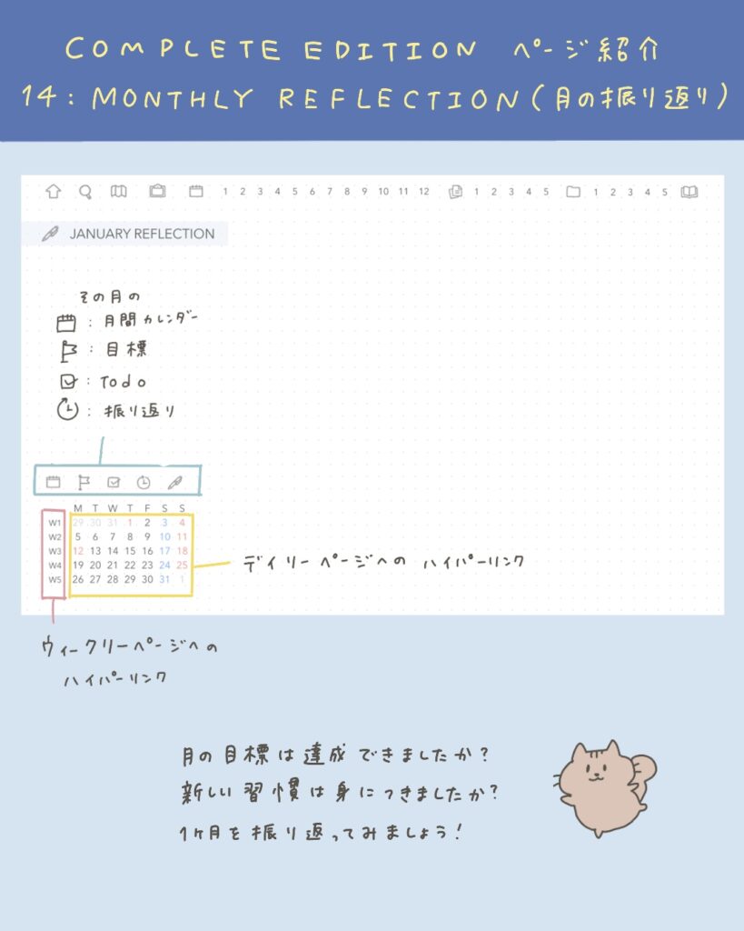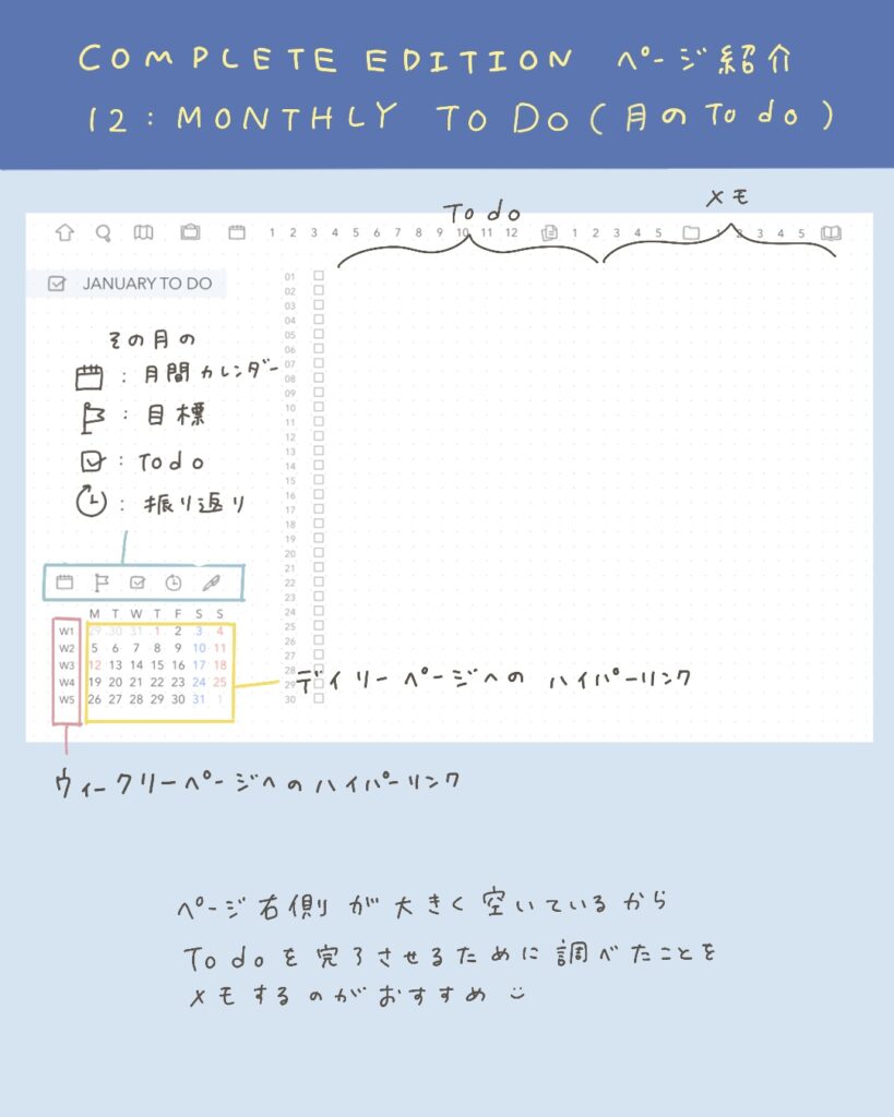 ページ左下には、その月の目標・To do・ハビットトラッカー・振り返りのページへのハイパーリンクがついていて、