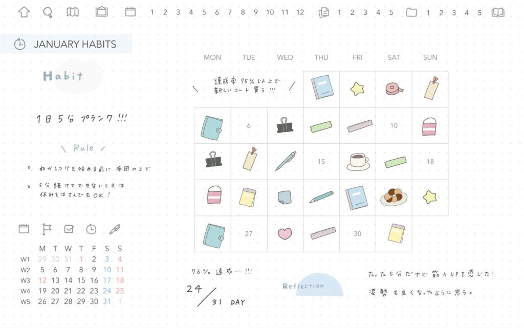 月の表記の下には、その月の目標・To do・ハビットトラッカー・振り返りのページへのハイパーリンクがついていて、目標達成や身につけたい習慣をすぐ確認することができます。