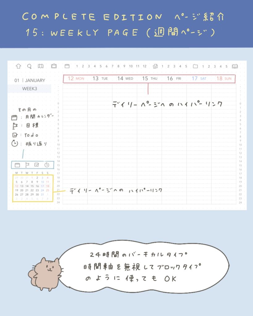 カレンダー左横の「WK」マークからはウィークリーページへ、日付ブロックからはデイリーページへ飛ぶことができます!