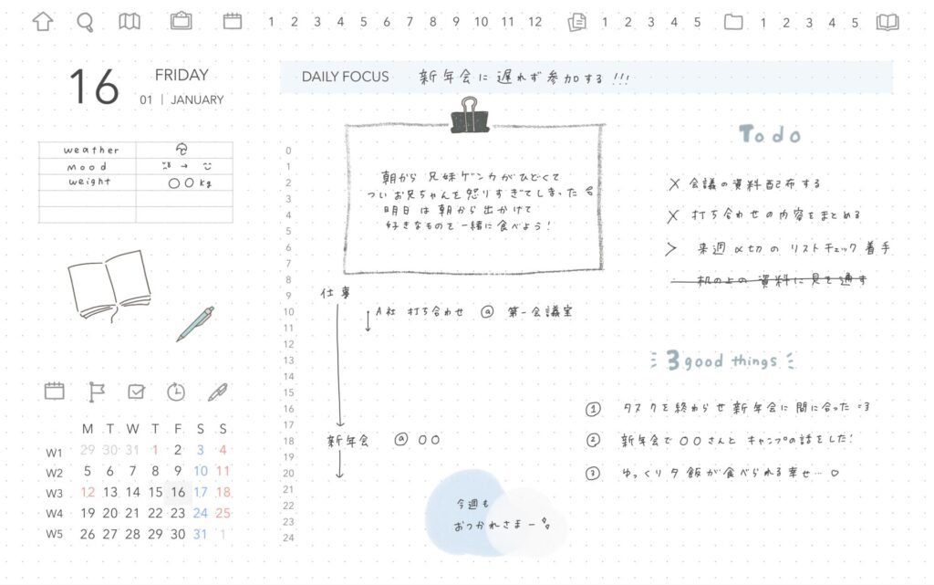 さらにその下のカレンダー部分にも、ウィークリーページとデイリーページへのパーリンクがついています🔗
