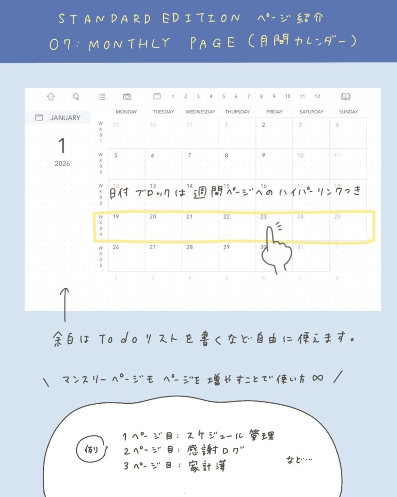 マンスリーページもページを増やすことで、1ページ目はスケジュール管理に、2ページ目は感謝ログに、3ページ目は家計簿に、といった形で何通りもの楽しみ方ができますよ〜!