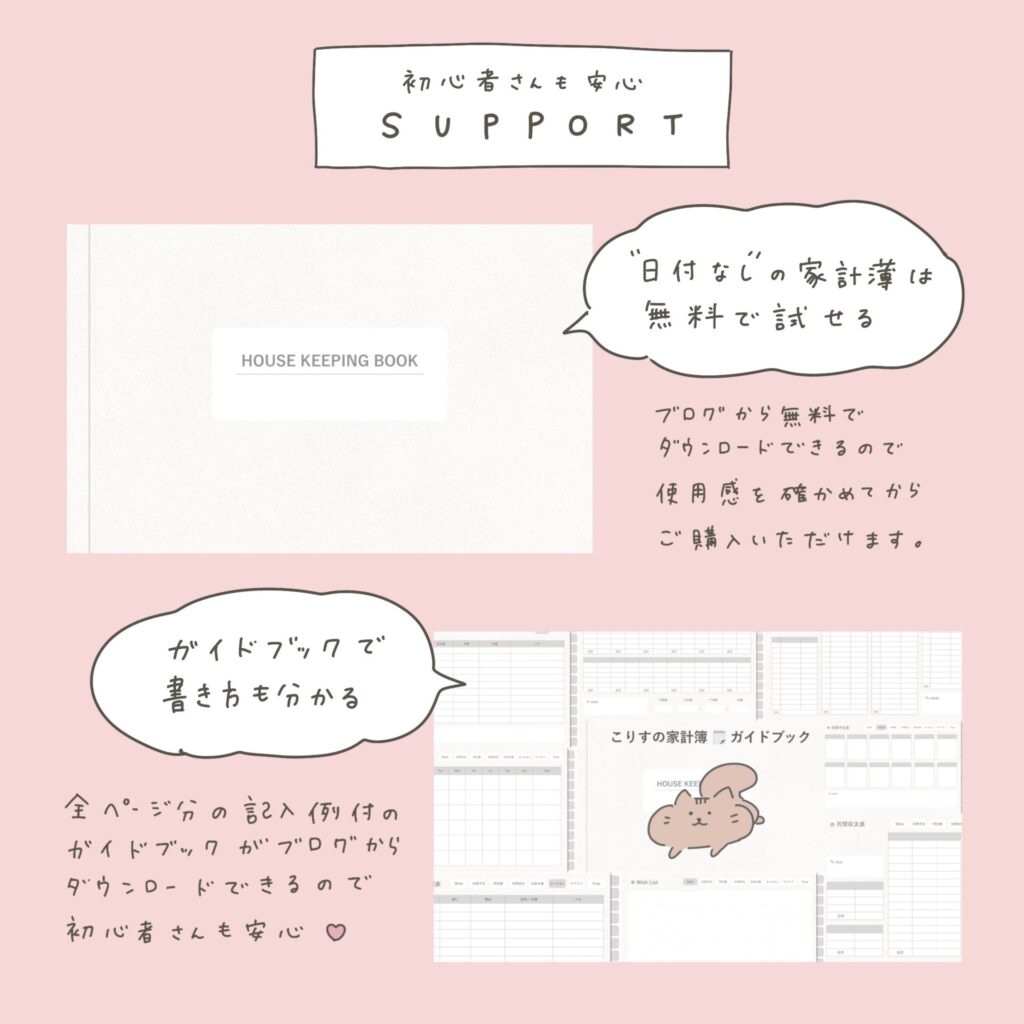さらに、全ページの記入例がついた「こりすの家計簿ガイドブック」もブログからダウンロードできるから、初心者さんも安心して始められますよ🫶